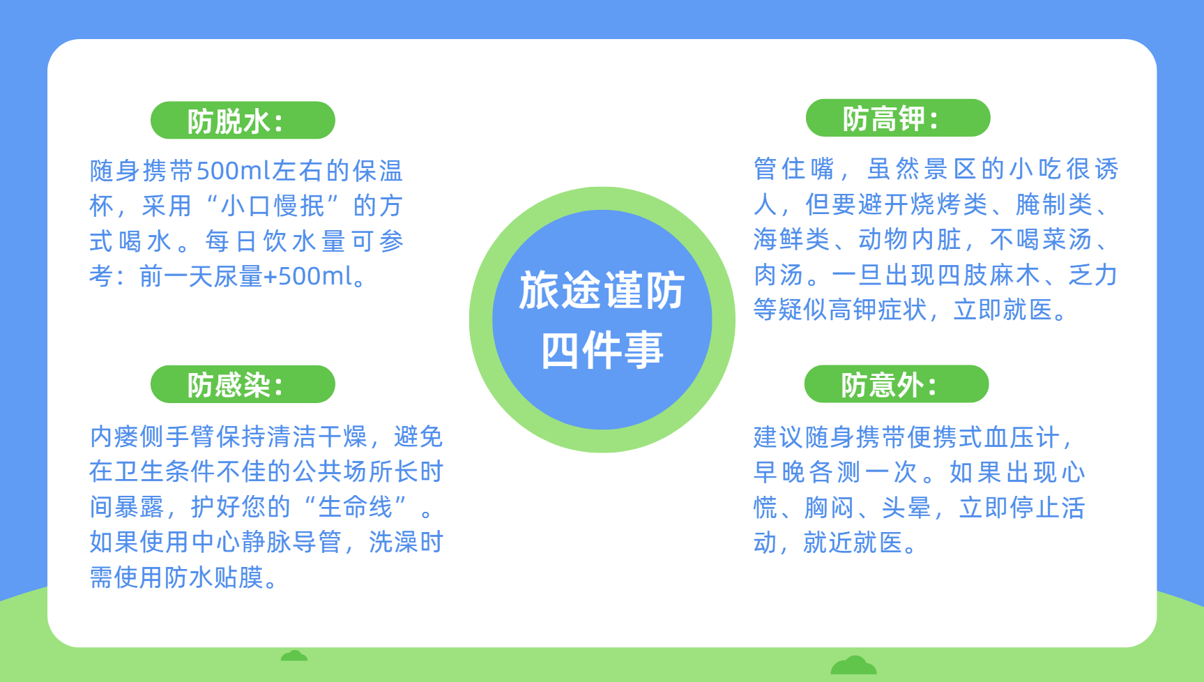 同时,准备好出行三件套:病历资料、常用药品、紧急联系卡。如果要去外地透析,提前联系好目的地的透析中心并确认异地医保结算。